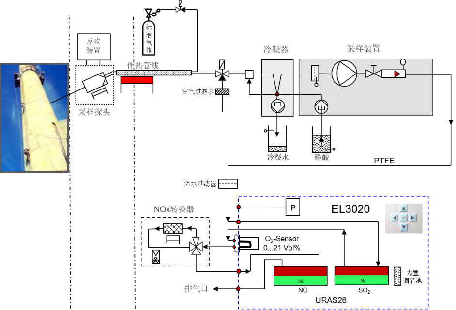 ACX-C150 配置 EL3000-Uras26 型非分散红外(NDIR)吸收原理分析仪,可以实现双量程的自动切换。SO2、NOx 的认证量程均满足超低排放监测要求。系统预处理采用完全抽取冷干法,配套磷酸滴定装置,有效解决了超低排放监测应用中 SO2 容易损失的问题。